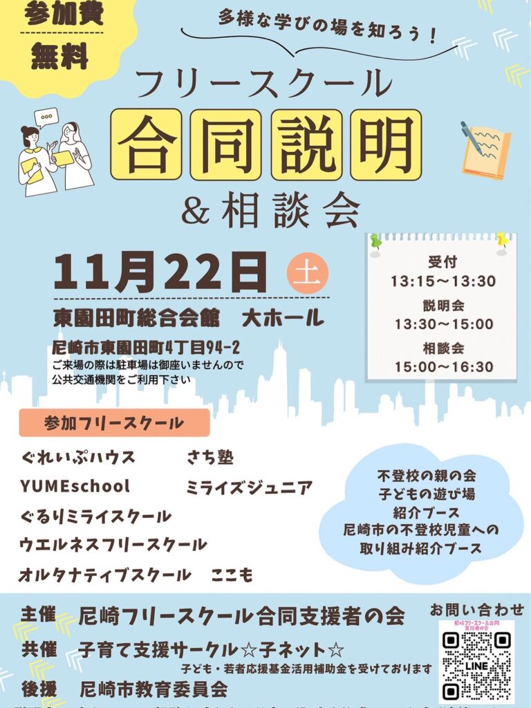 11:00〜尼崎フリースクール合同支援者の会代表 西島由美子さん、ウエルネスフリースクールの山本さん、西尾さんにお越し頂き尼崎フリースクール合同説明会のお話伺います。